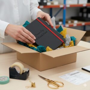 Finally, the journals are securely packed using poly bags, waterproof wrapping, and export-grade cartons. Shipping options include sea, air, or express delivery, with flexible payment terms (50% deposit upfront). This structured workflow ensures reliable delivery of professional hardcover diaries, personal diaries with name, and customize journal notebooks for wholesale buyers.